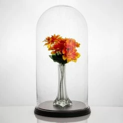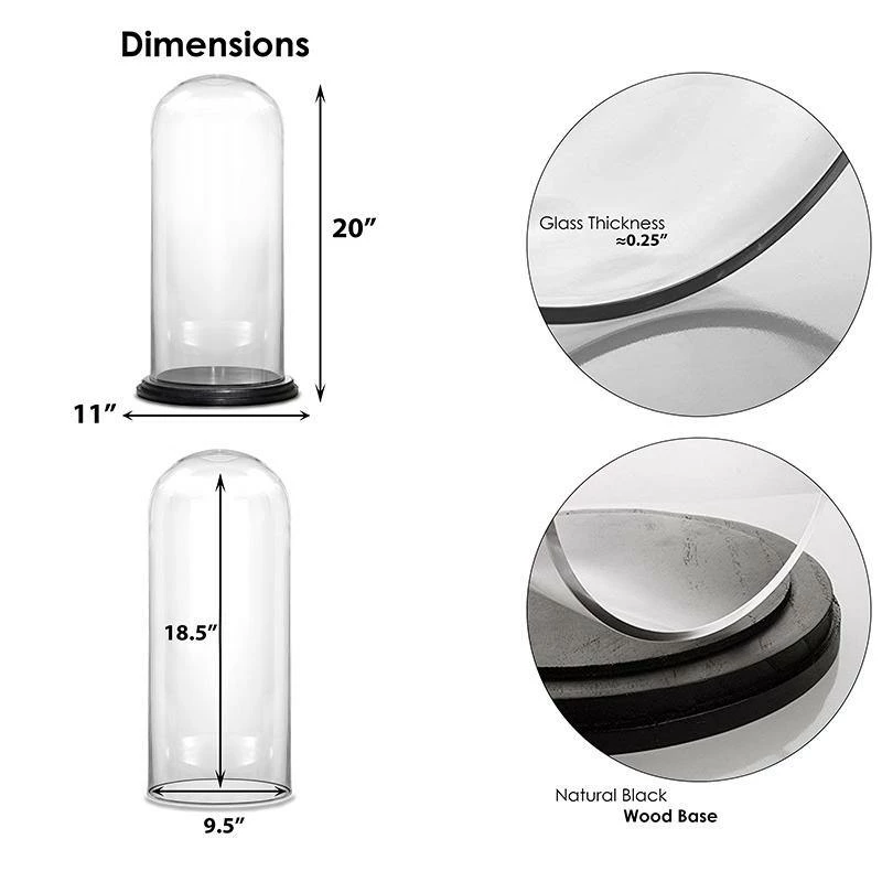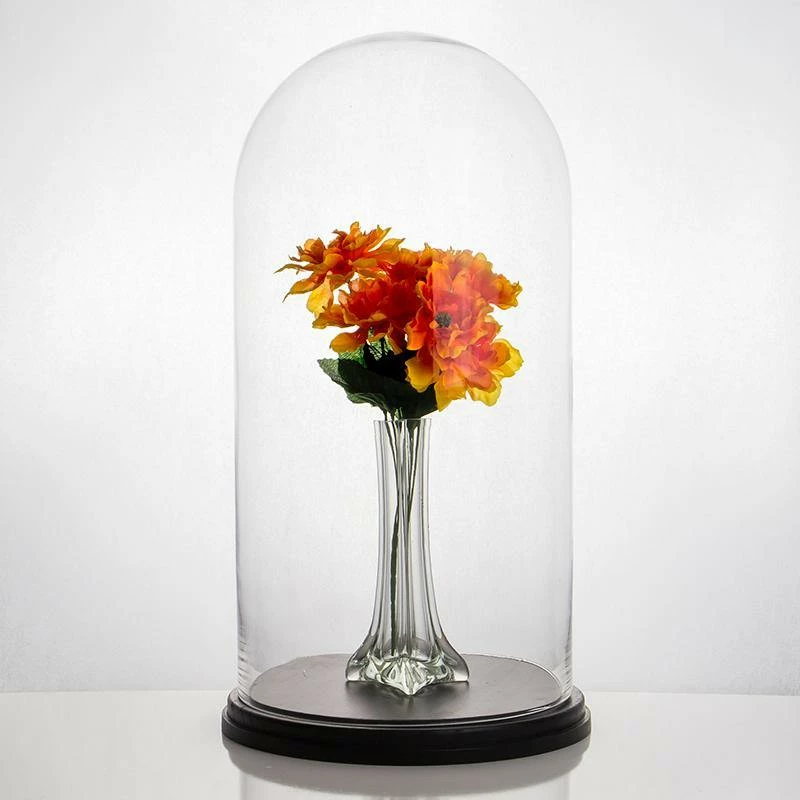 With no corners, the cloche dome has a unique feel of guarding everything that lies within its body. The transparent glass acts as a barrier to protect and display the beautiful world that lies withinβthe perfect storage unit for home decors to showcase the delicate unique masterpiece within. The dark wooden base at the bottom sets the ideal stage to draw all attention to what lies above.