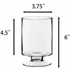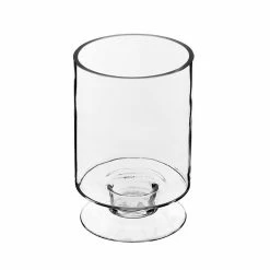 Short, sturdy pedestals support each of these decoratively versatile hurricanes, simply styled with straight-sided walls. This hurricanes candle holder has a large disk foot as broad as the shade itself. It accommodates a small votive candle.