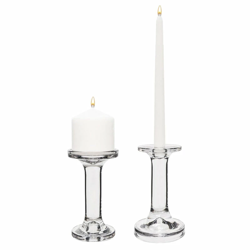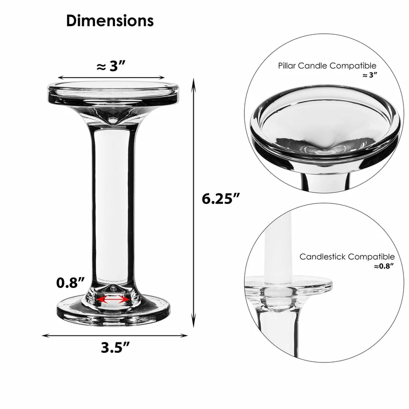 This sophisticatedย clear glass set has a circular spindle shape similar to classic wood-turned candlesticks or baluster pillars. Easily holds pillar candles up to 3.5 inches in diameter or any standard sized taper candles.