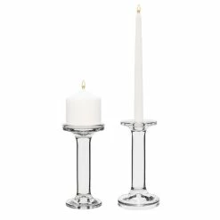 This sophisticatedย clear glass set has a circular spindle shape similar to classic wood-turned candlesticks or baluster pillars. Easily holds pillar candles up to 3.5 inches in diameter or any standard sized taper candles.
