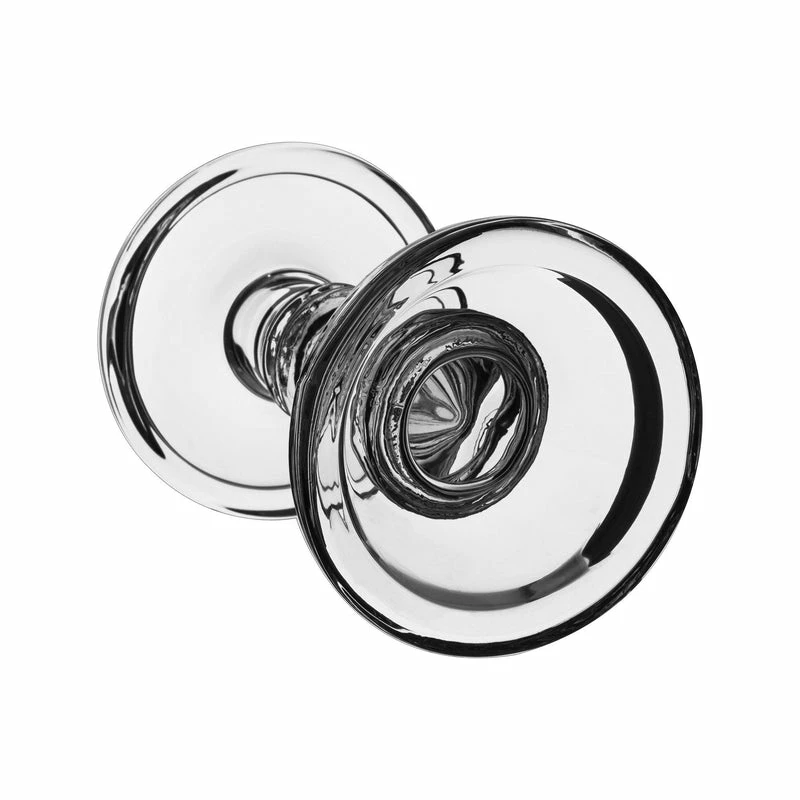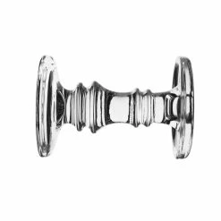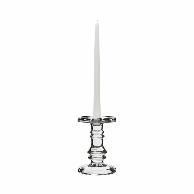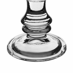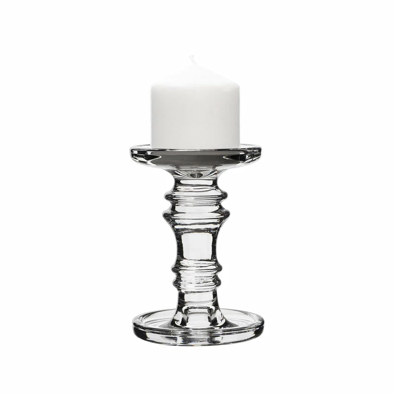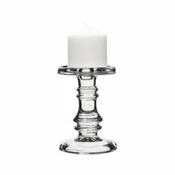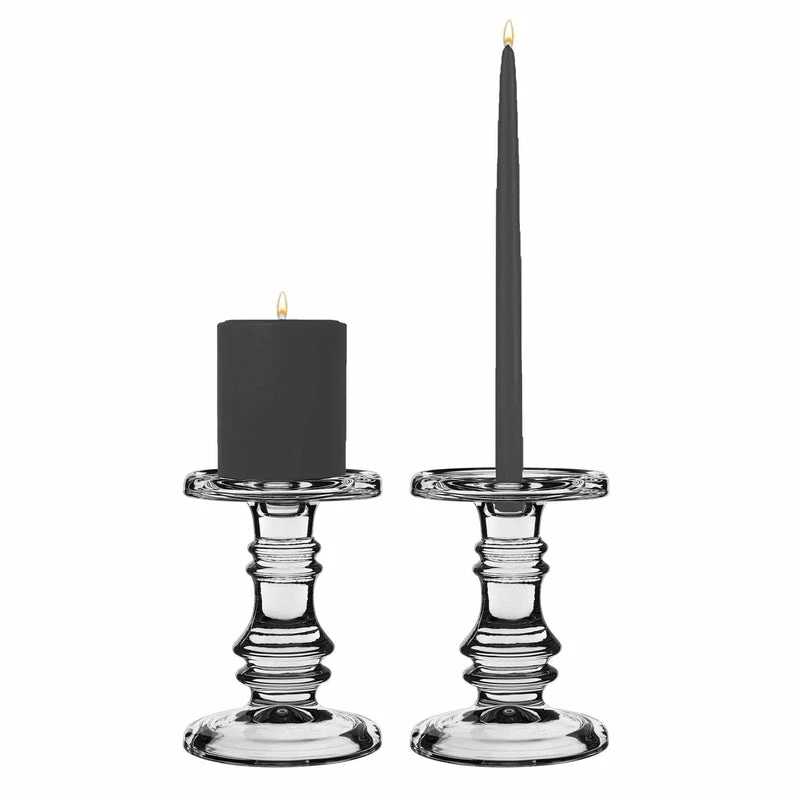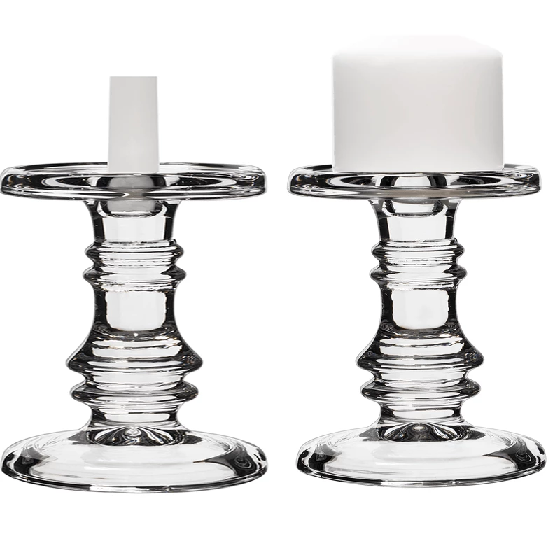 This sophisticatedΒ clear glass set has a circular spindle shape similar to classic wood-turned candlesticks or baluster pillars. Easily holds pillar candles up to 3.5 inches in diameter or any standard sized taper candles.