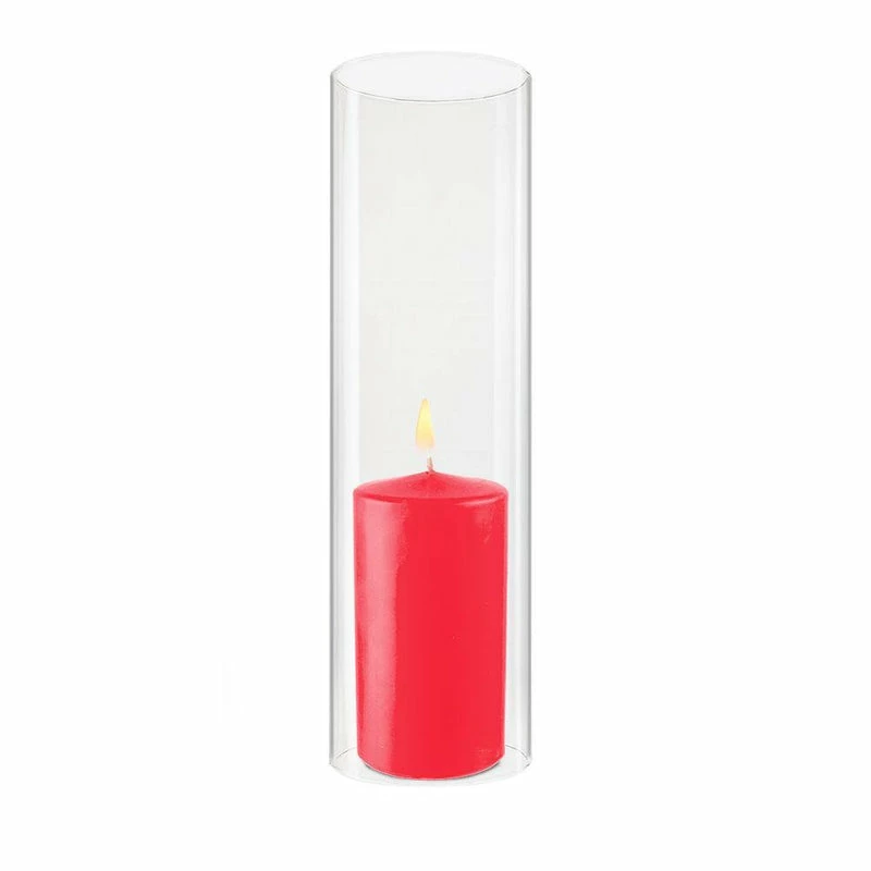 An open-ended candle holder for pillar candles or taper candles. This candle shield does not have a bottom. A contemporary design hurricane candle holder makes an impressive display in your home. Easy to place over lit candles. It allows a mess-free candle lighting experience. No more dripping wax onto the side of the glass. Bottomless cylindrical glass shield for open flame candles