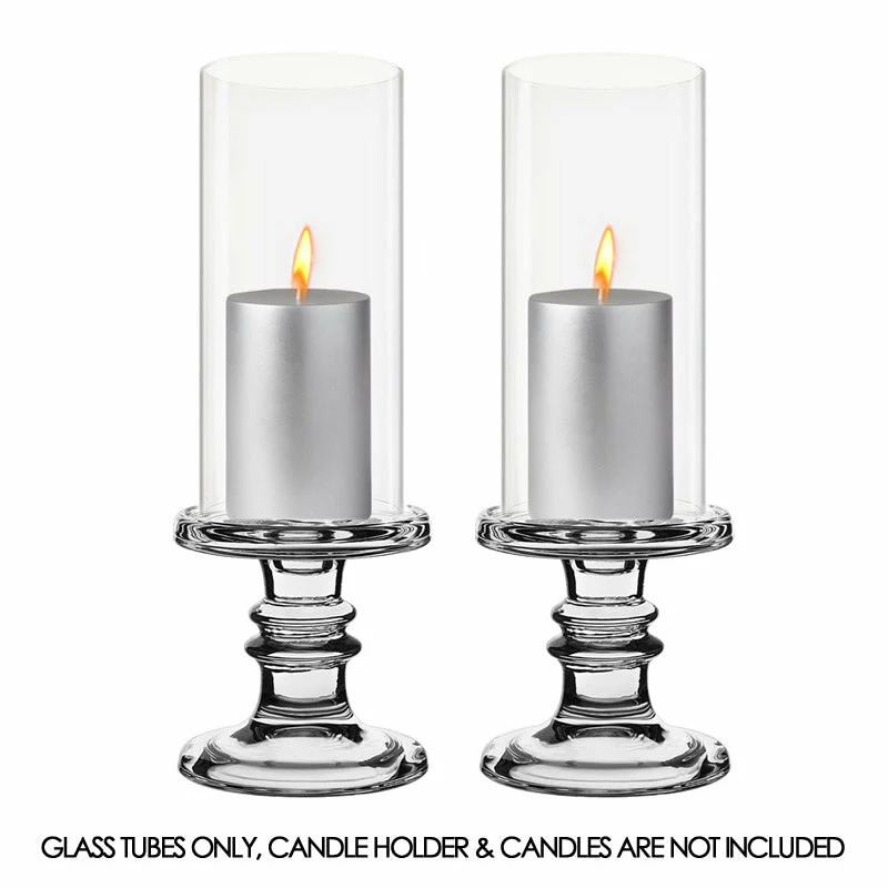 An open-ended candle holder for pillar candles or taper candles. This candle shield does not have a bottom. A contemporary design hurricane candle holder makes an impressive display in your home. Easy to place over lit candles. It allows a mess-free candle lighting experience. No more dripping wax onto the side of the glass. Bottomless cylindrical glass shield for open flame candles