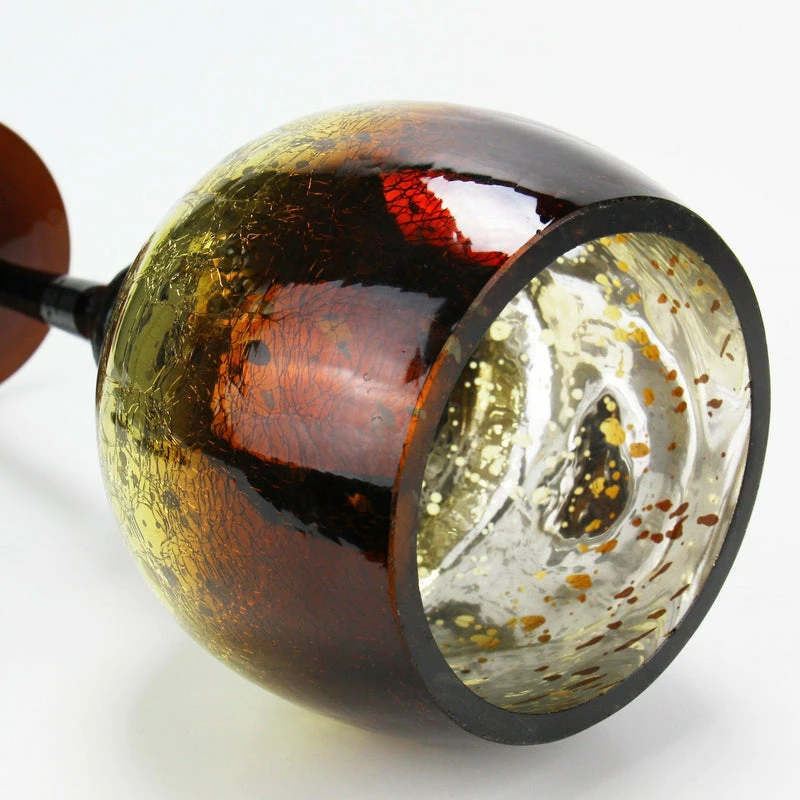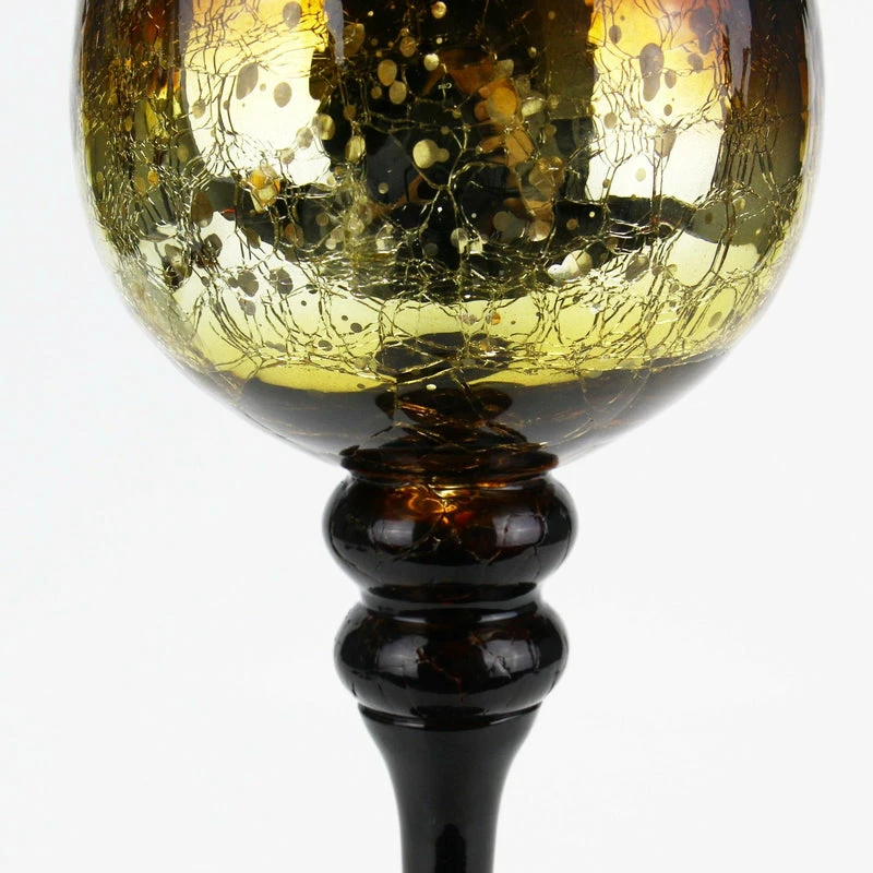 Three sets of 3 long stems (12, 14, 16 inches tall) candle holders for floating candles (Total of 9 pcs). This series of classic brown mercury metallic crackle glass candle holders is tall. The gorgeous crackled glass design has its unique classic elegant look. The long-stemmed brown glass design with numerous clear transparent speckles allows any candle color to gleam in its surroundings. Whether you are planning a wedding, a holiday party, or an anniversary celebration, these darling candleholders will illuminate your event with class. A popular design for these elegant candle holders is to arrange an array of candles in varying heights for a dynamic layout. The open flame from the candle would burn within the glass brown cup.