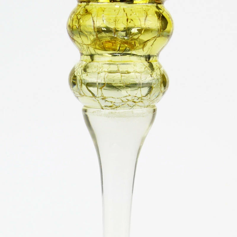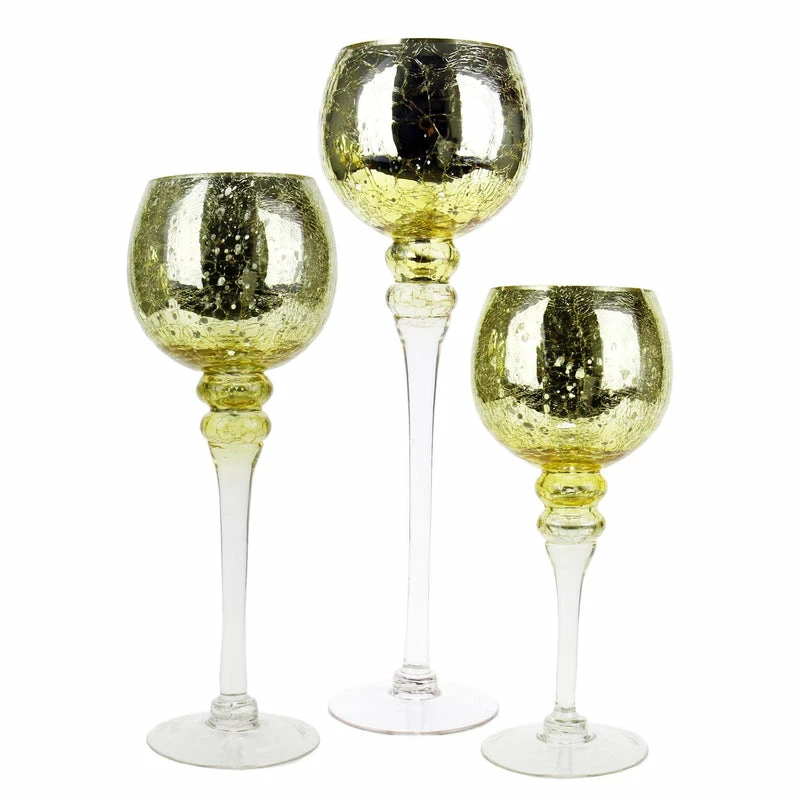 Three sets of 3 long stems (12, 14, 16 inches tall) candle holders for floating candles (Total of 9 pcs). This series of classicย gold mercury metallic crackle glass candle holders is tall. The gorgeous crackled glass design has its unique classic elegant look. The long-stemmedย gold glass design with numerous clear transparent speckles allows any candle color to gleam in its surroundings. Whether you are planning a wedding, a holiday party, or an anniversary celebration, these darling candleholders will illuminate your event with class. A popular design for these elegant candle holders is to arrange an array of candles in varying heights for a dynamic layout. The open flame from the candle would burn within the glassย gold cup.