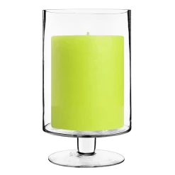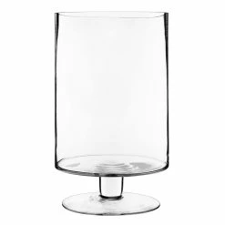 Short, sturdy pedestals support each of these decoratively versatile hurricanes, simply styled with straight-sided walls. This hurricanes candle holder has a large disk foot as broad as the shade itself. It accommodates a small votive candle.