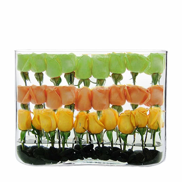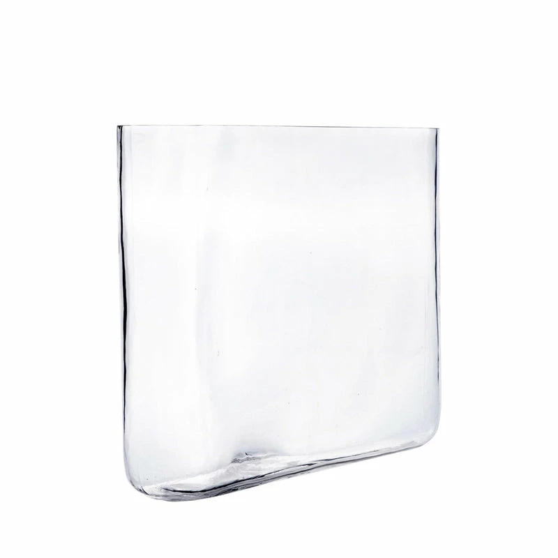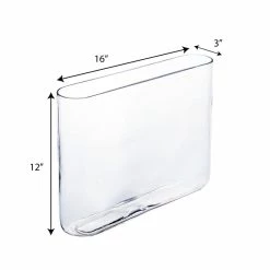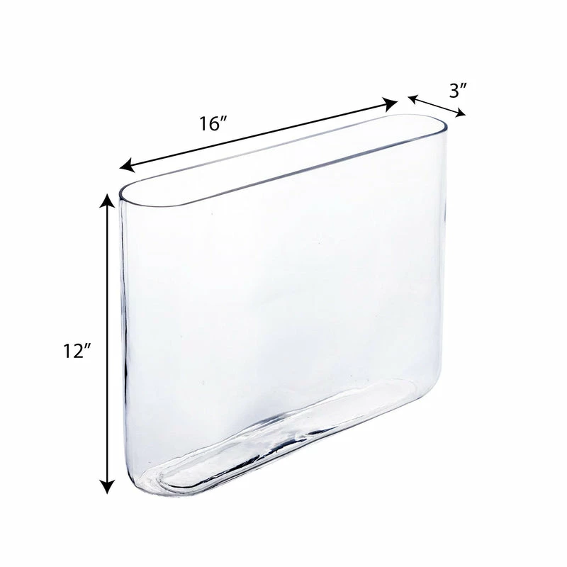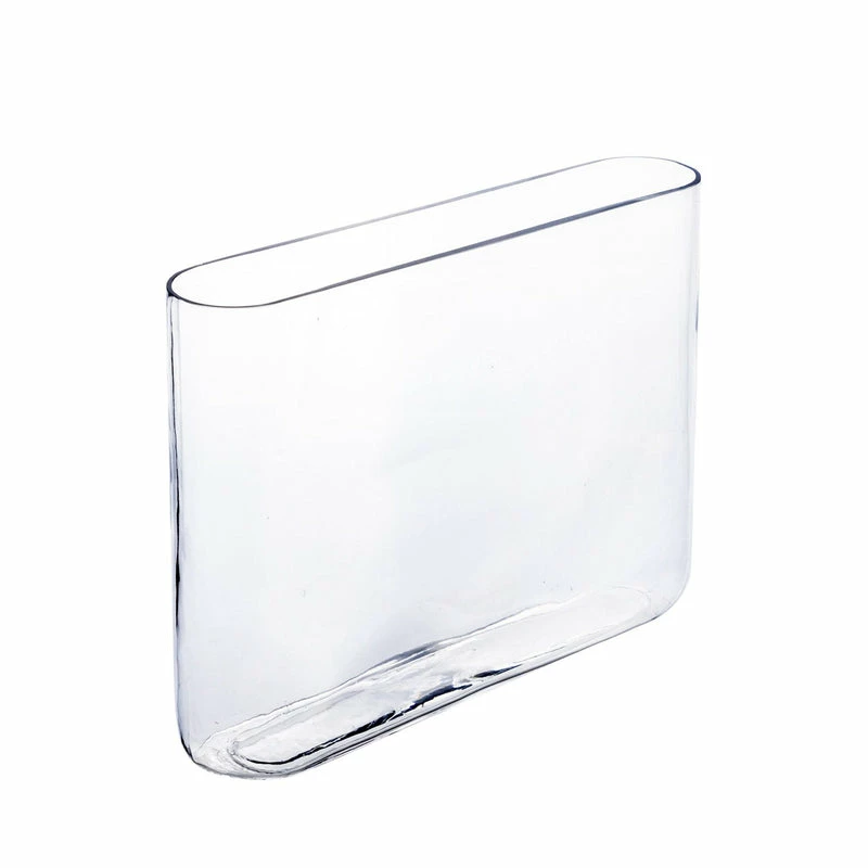 This vase design takes an elongated rectangular oval silhouette. These glass vases will complement an attractive array of short-stem fresh-cut flowers. Marbles, river rocks or other decorative vase fillers can be added to the arrangement to hold the flowers in place and to add variations to the design. These glass vases will bring a modern flair to your design.