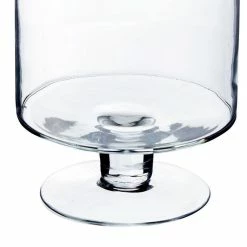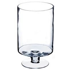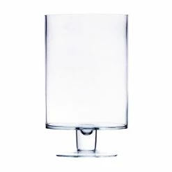 Short, sturdy pedestals support each of these decoratively versatile hurricanes, simply styled with straight-sided walls. This hurricanes candle holder has a large disk foot as broad as the shade itself. It accommodates a small votive candle.
