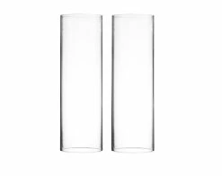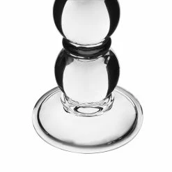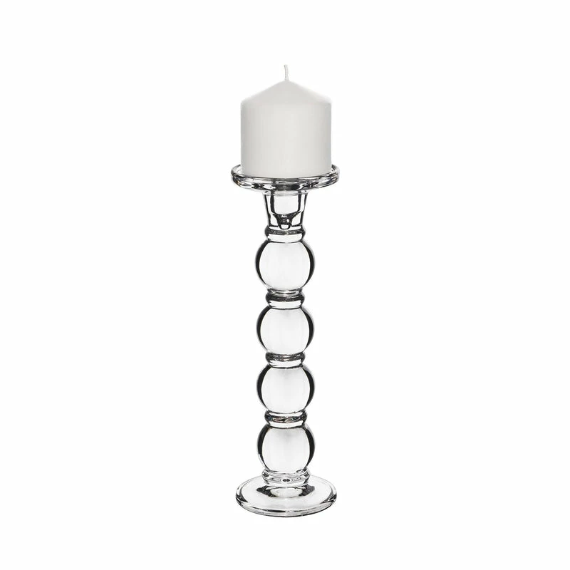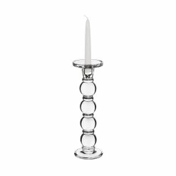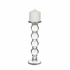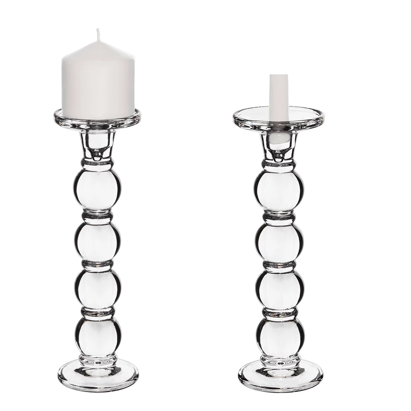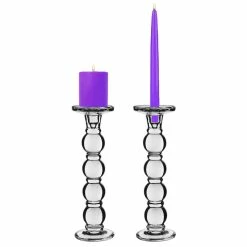 This sophisticatedΒ clear glass set has a circular spindle shape similar to classic wood-turned candlesticks or baluster pillars. Easily holds pillar candles up to 3.5 inches in diameter or any standard sized taper candles.