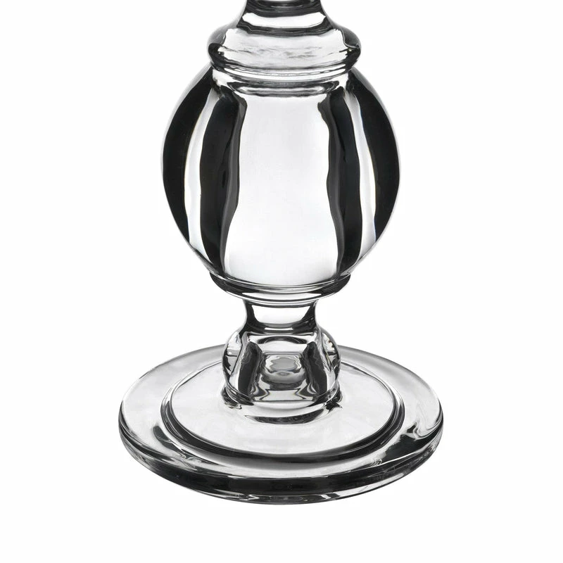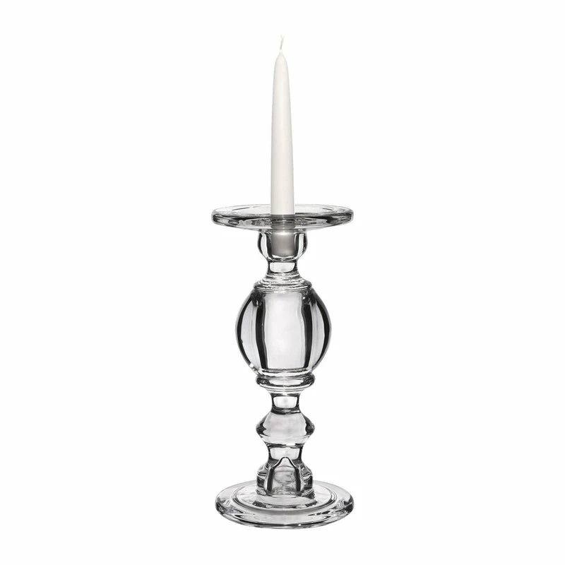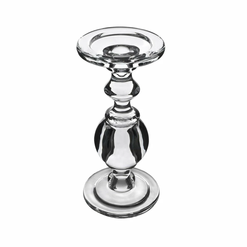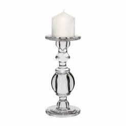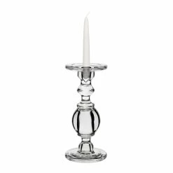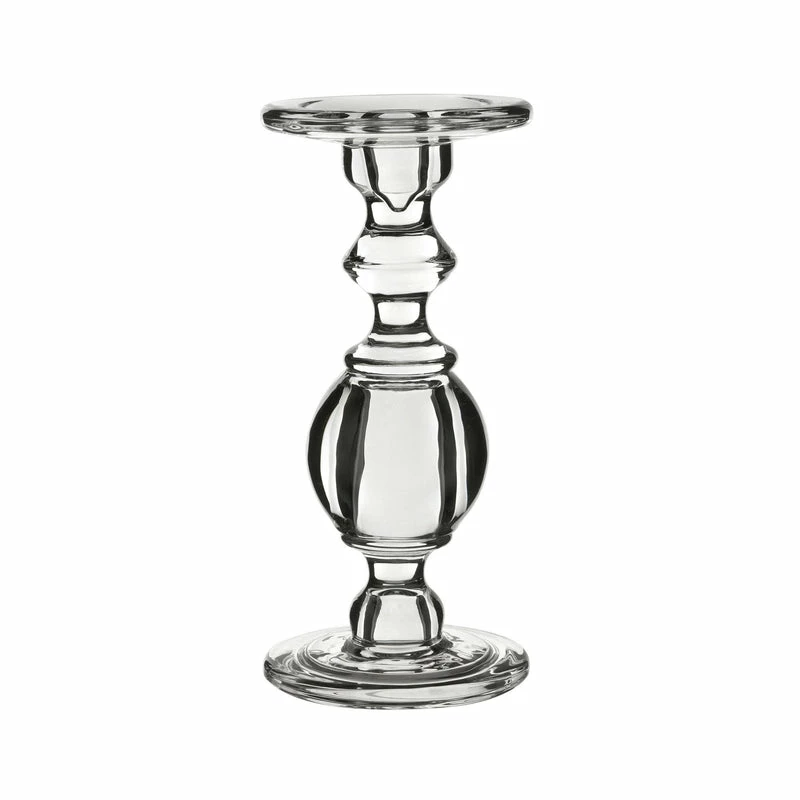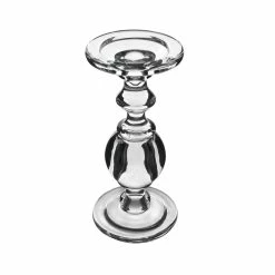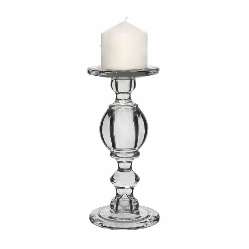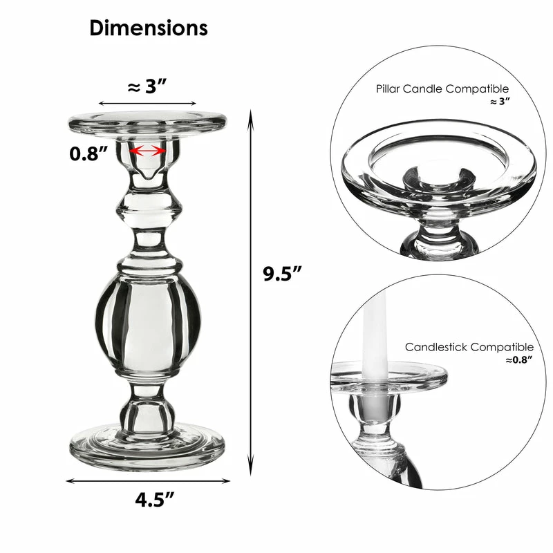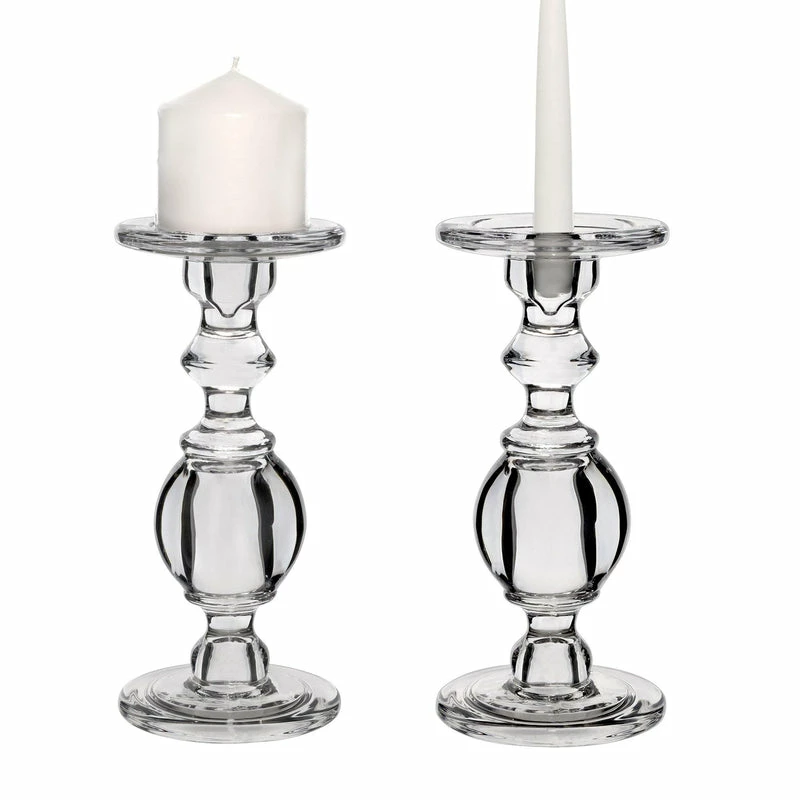 This sophisticatedย clear glass set has a circular spindle shape similar to classic wood-turned candlesticks or baluster pillars. Easily holds pillar candles up to 3.5 inches in diameter or any standard sized taper candles.