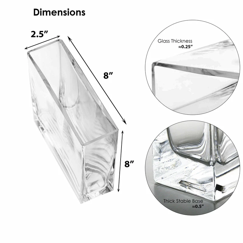 Glass rectangular vases, commonly referred to as rectangles are best sellers in the floral supply, home dรฉcor, and wedding planning industry. From home decorators to event planners, everyone appreciates a high-quality thick glass rectangular vase. It will enhance any romantic event when filled with roses, even restaurant tables when filled with candles, or any party when filled with lights and vase fillers. Looking for a classically fresh home decor accent or centerpiece for your next event? Our rectangle glass vase is perfectly shaped for slim decor elements, small floral arrangements, and more. It can also be used as a decorative accent, a terrarium, or a modern storage container. While simple, this rectangle vase can house anything from floral arrangements to seasonal ornaments. You can use the glass rectangle vase to hold multiple bouquets, creating an array of textures and colors. This glass vase can be used as a glorious centerpiece.